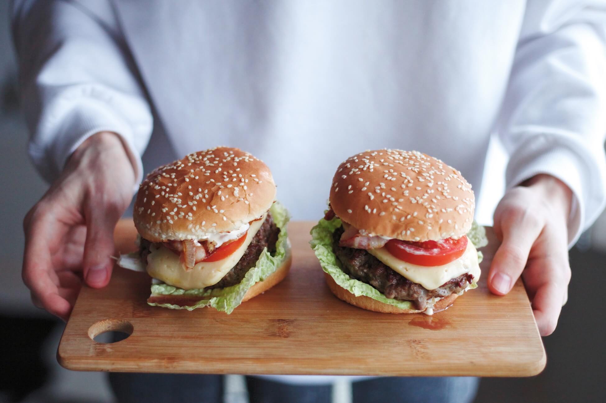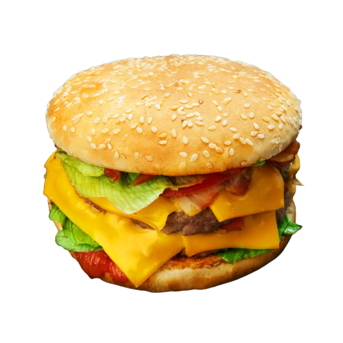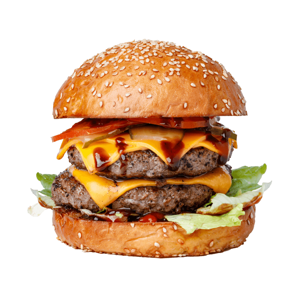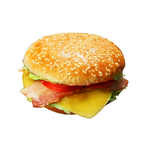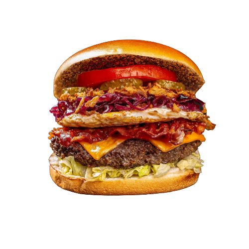 Juicy beef patty stacked with smoked bacon, melted cheese, caramelised onions, fresh tomato slices, gem lettuce, tomato & sweet corn salsa. Served on homemade bread with our house dressing. (Gluten, Dairy, Egg)