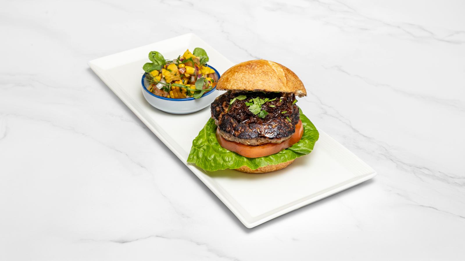 Juicy beef patty stacked with fresh tomato slices, gem lettuce, tomato & sweet corn salsa.
